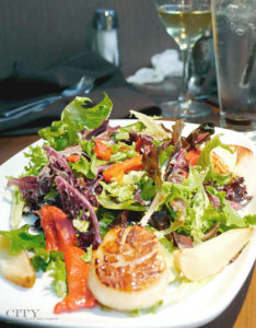 Pear Scallop and Roasted Red Pepper Salad with Golden Raspberry Vinaigrette