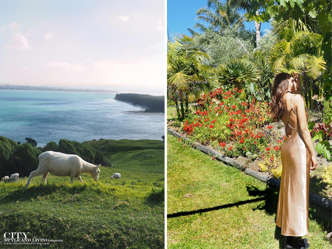City style and living magazine Editors Notebook style fashion blogger Shivana M sheep eating grass overlooking the ocean and gold dress at mercury bay winery garden new zealand